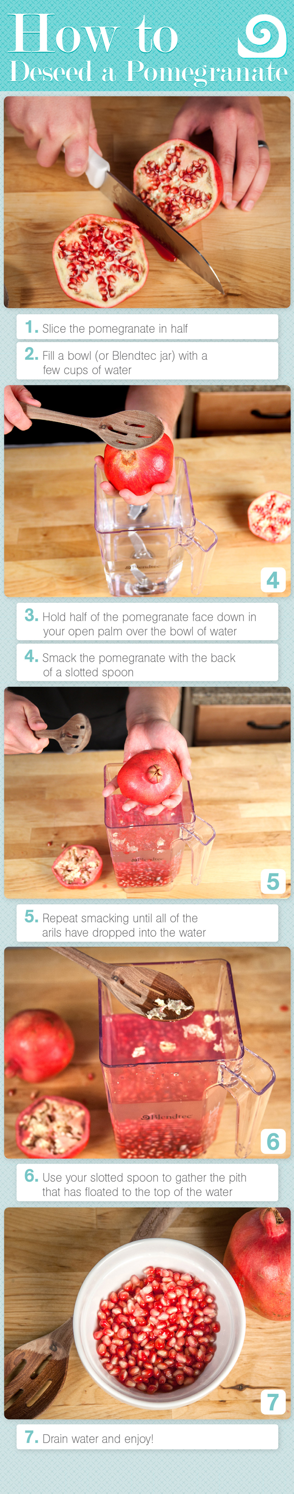 UPDATE!! I just found an amazingly quick new way to get the job done! Yes, you can still read on below for a potentially less messy way to de-seed a pomegranate, but this way will get you there in a fraction of the time (and if you stay close to the bowl of water, you shouldn’t get much splatter): http://www.blendtec.com/blog/2012/10/12/how-to-deseed-a-pomegranate/. Note: from my experience, it’s easier if you keep rotating the pom in your hand as you’re smacking it around!